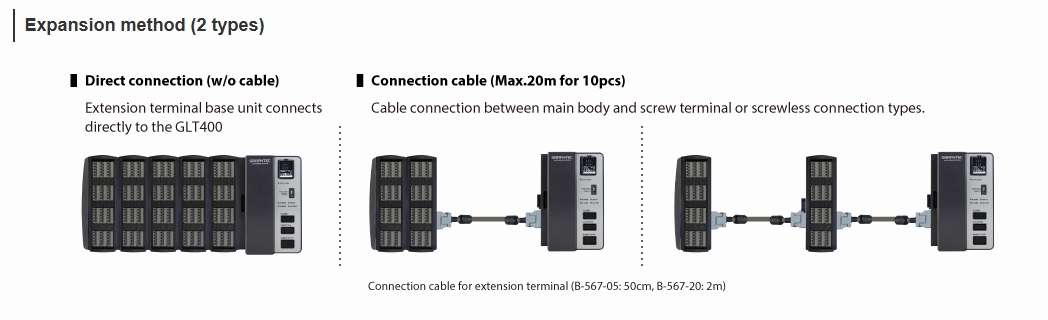 GLT400 is a multi-use data logger that can be used as a extension unit and a stand-alone measurement such as utilization at research and development, newly expanding the sector to production engineering and production, incorporation into control panels and devices, data acquisition from PLCs via Modbus/TCP, and as PC loggers.