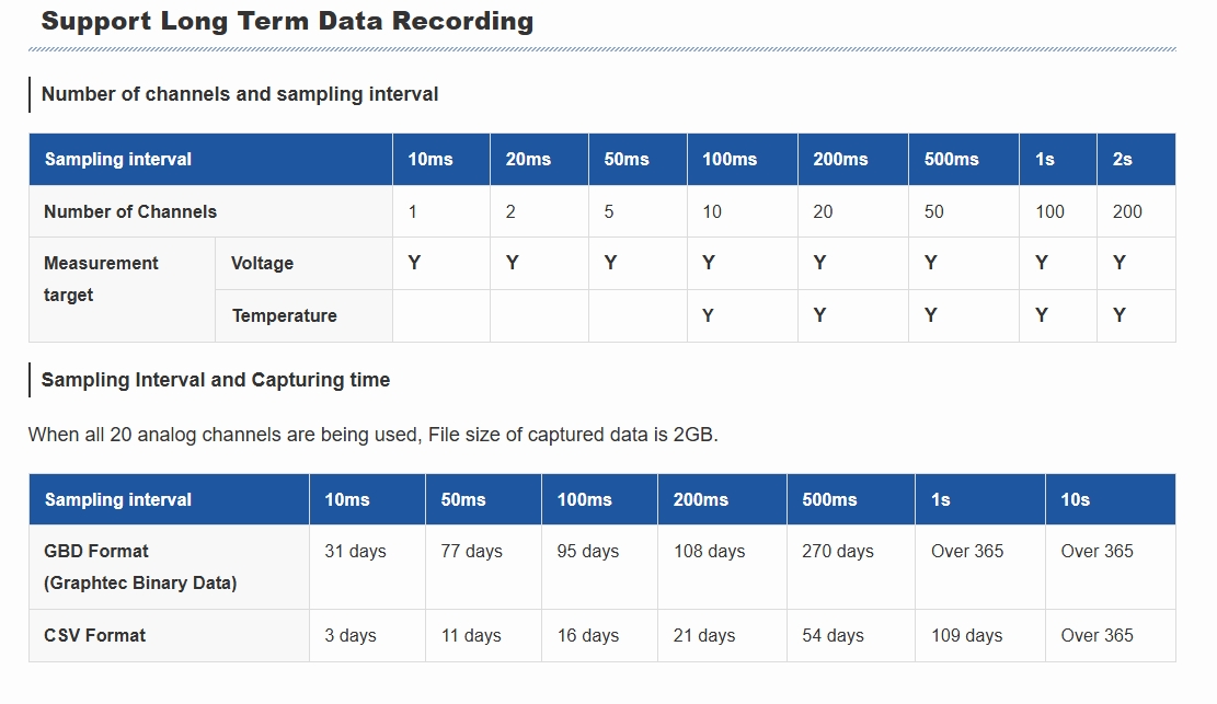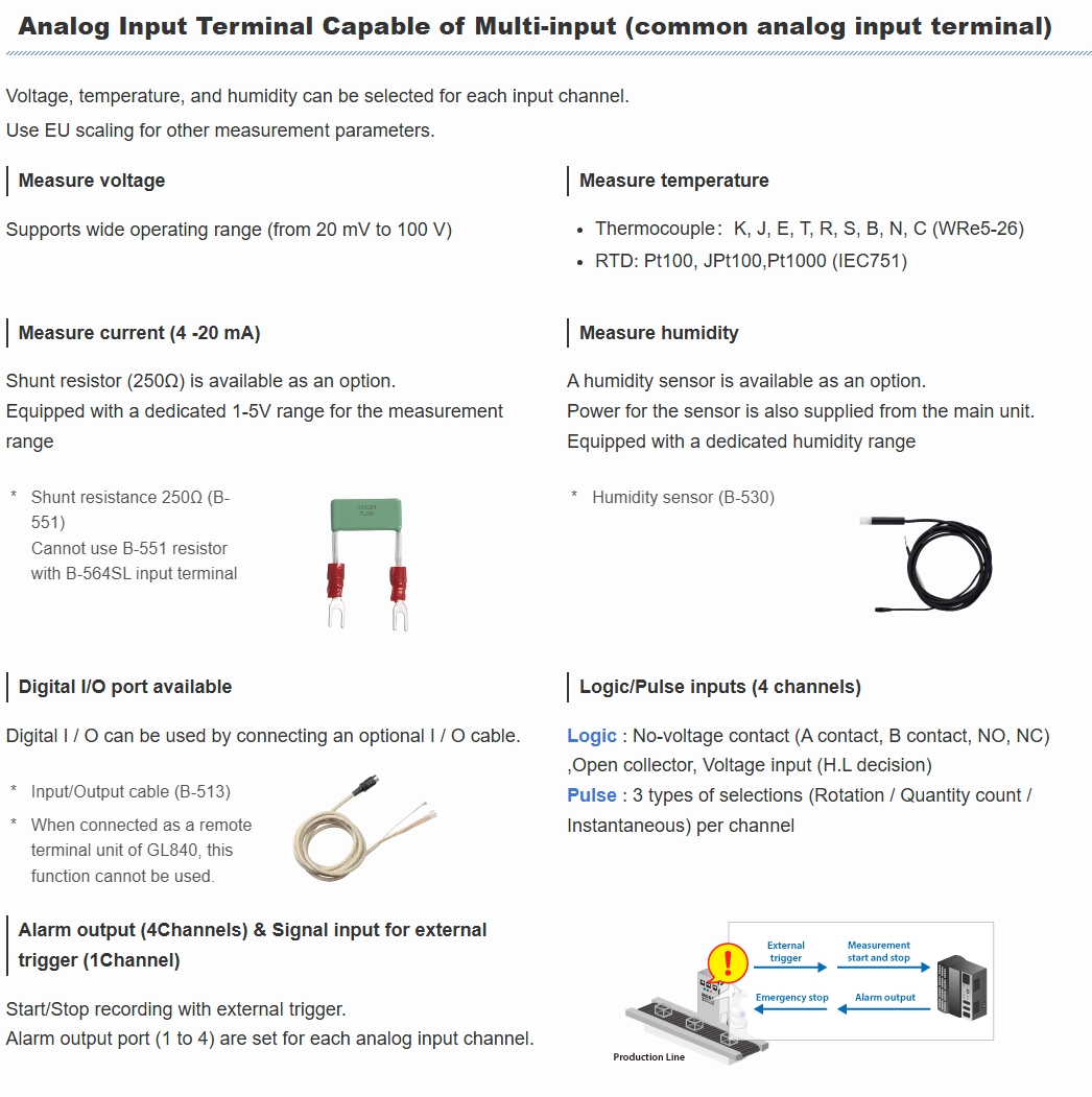 Three types of analog input terminals are available in the lineup, which can be selected due to the input type, and can be expanded from the standard 20 channels to a maximum of 200 channels.