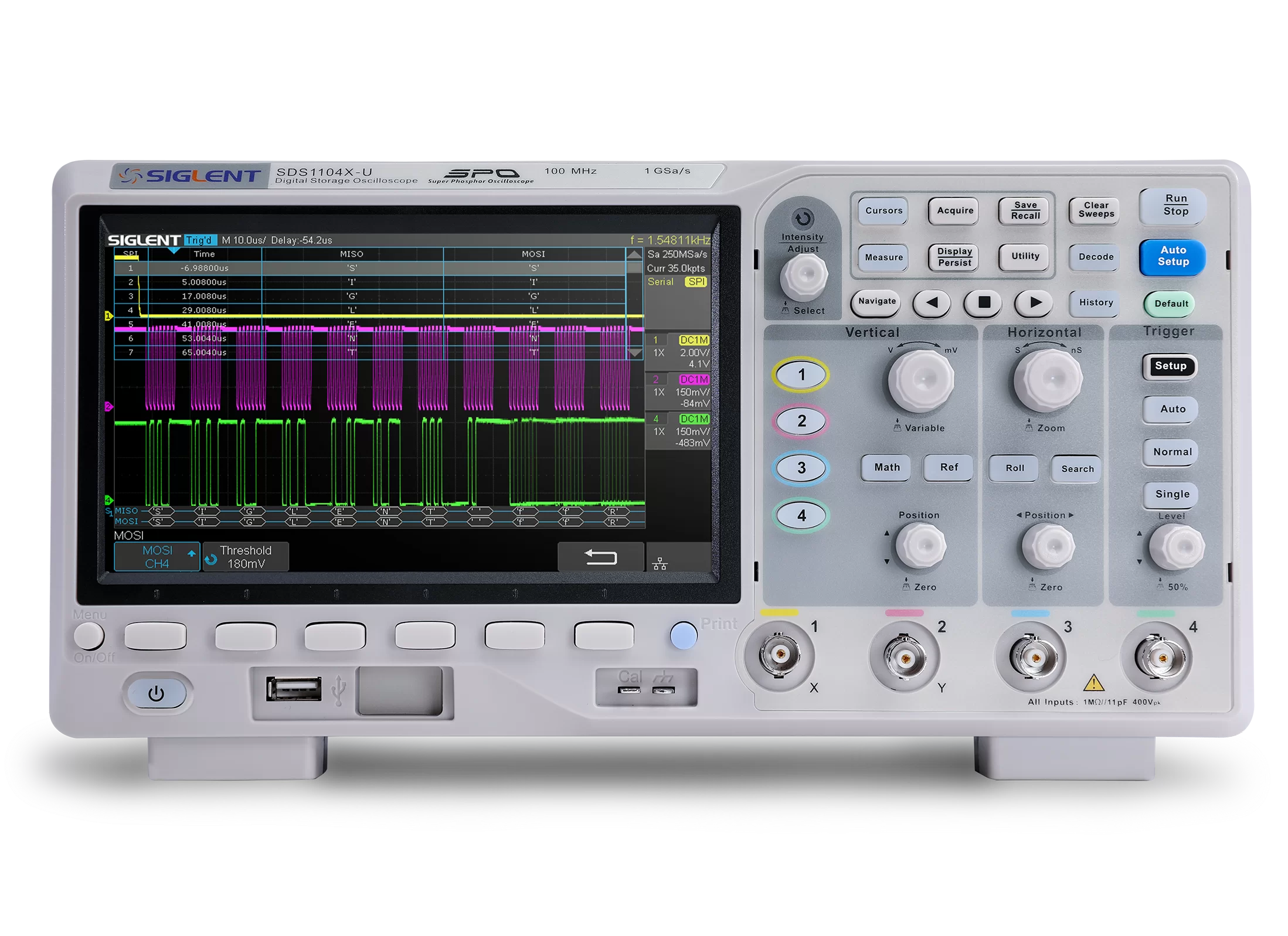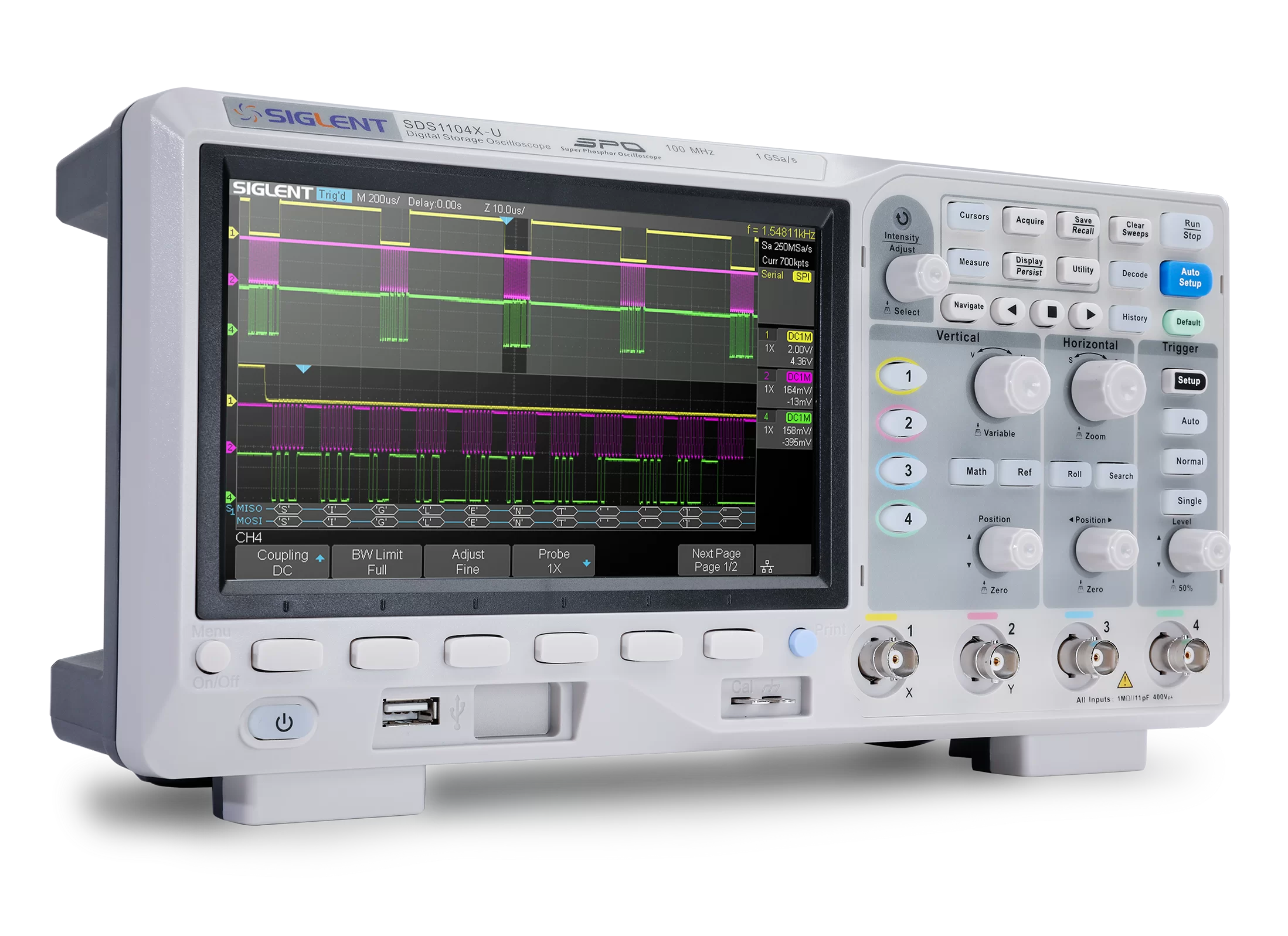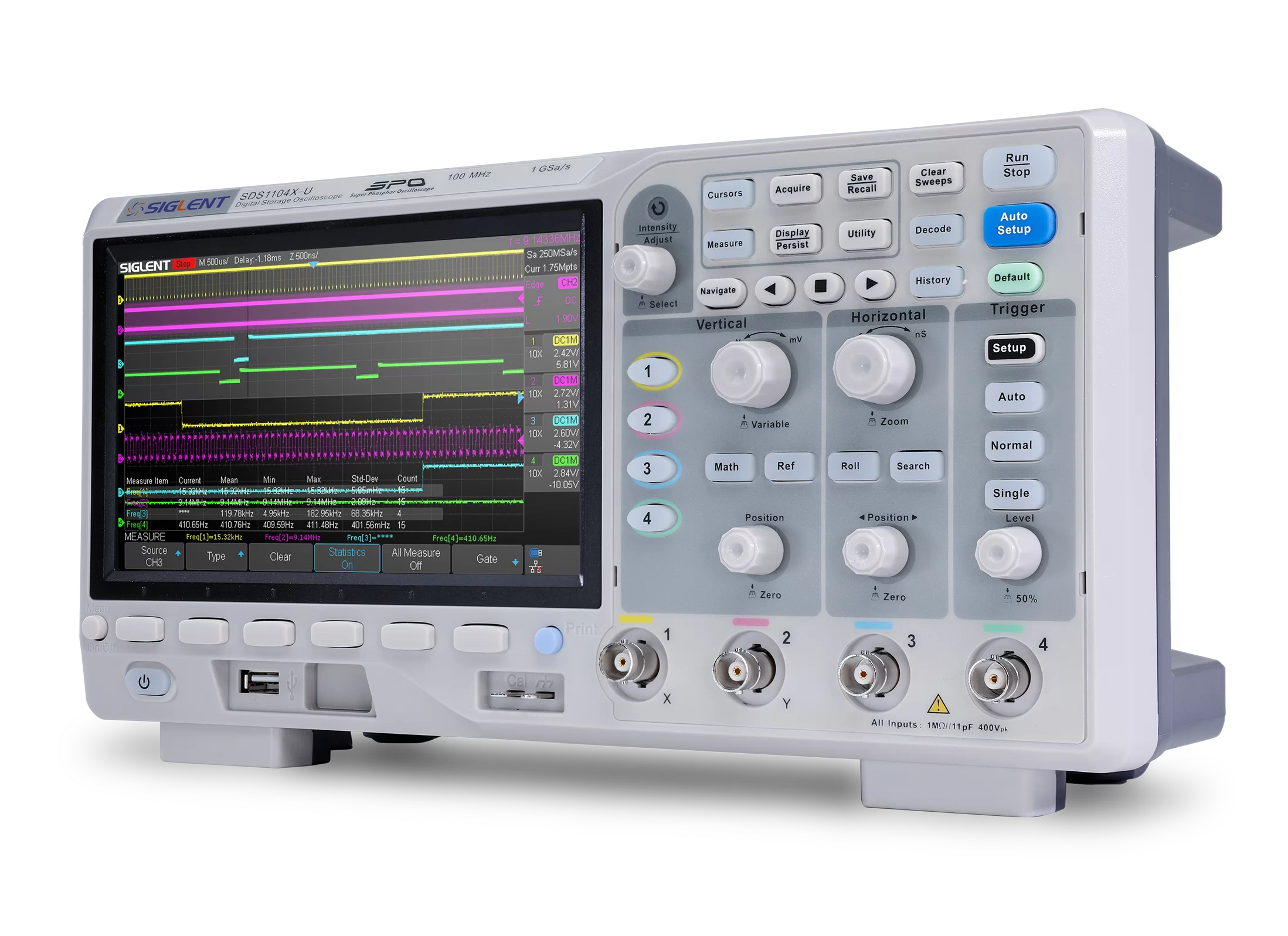 The SDS1000X-U series employs SPO (Super Phosphor Oscilloscope) technology that provides excellent signal fidelity and performance. It comes with an innovative digital trigger system with high sensitivity and low jitter, and a waveform capture rate of 400,000 frames/sec (sequence mode). The SDS1000X U also employs a 256 level intensity grading display function and a color temperature display mode not found in other models in this class.